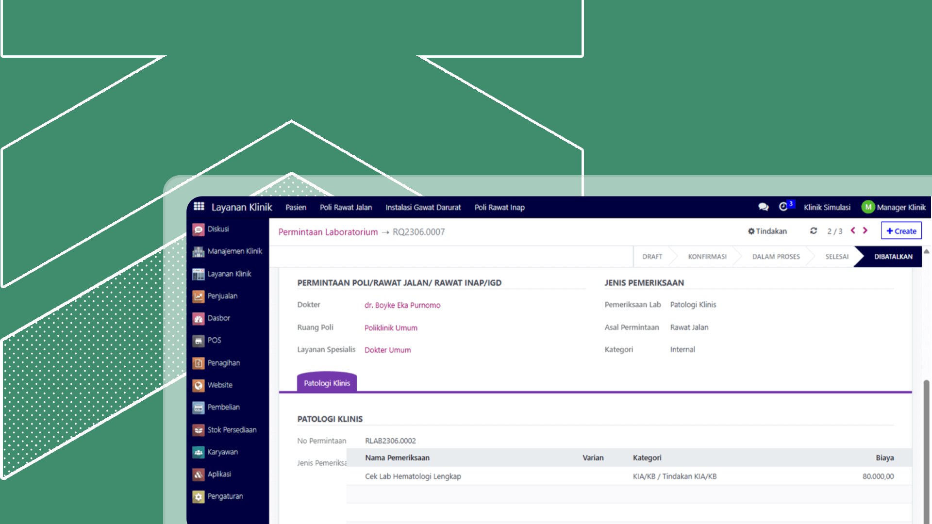 Input hasil lab langsung ke sistem, terhubung ke rekam medis, sehingga dokter bisa membaca hasil dengan cepat dan akurat.