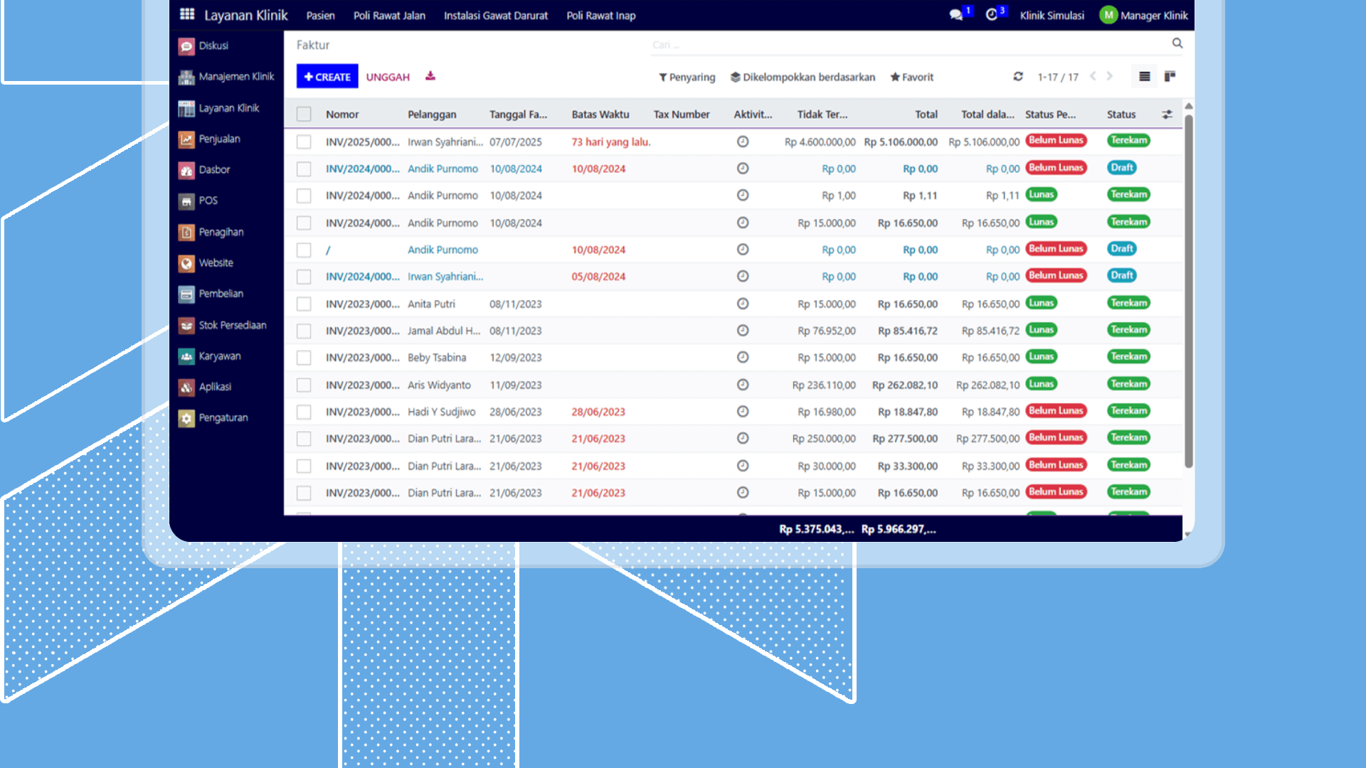 Penjadwalan dokter, reminder otomatis, dan sistem pembayaran (tunai, digital, maupun kartu) terhubung langsung dengan billing klinik.