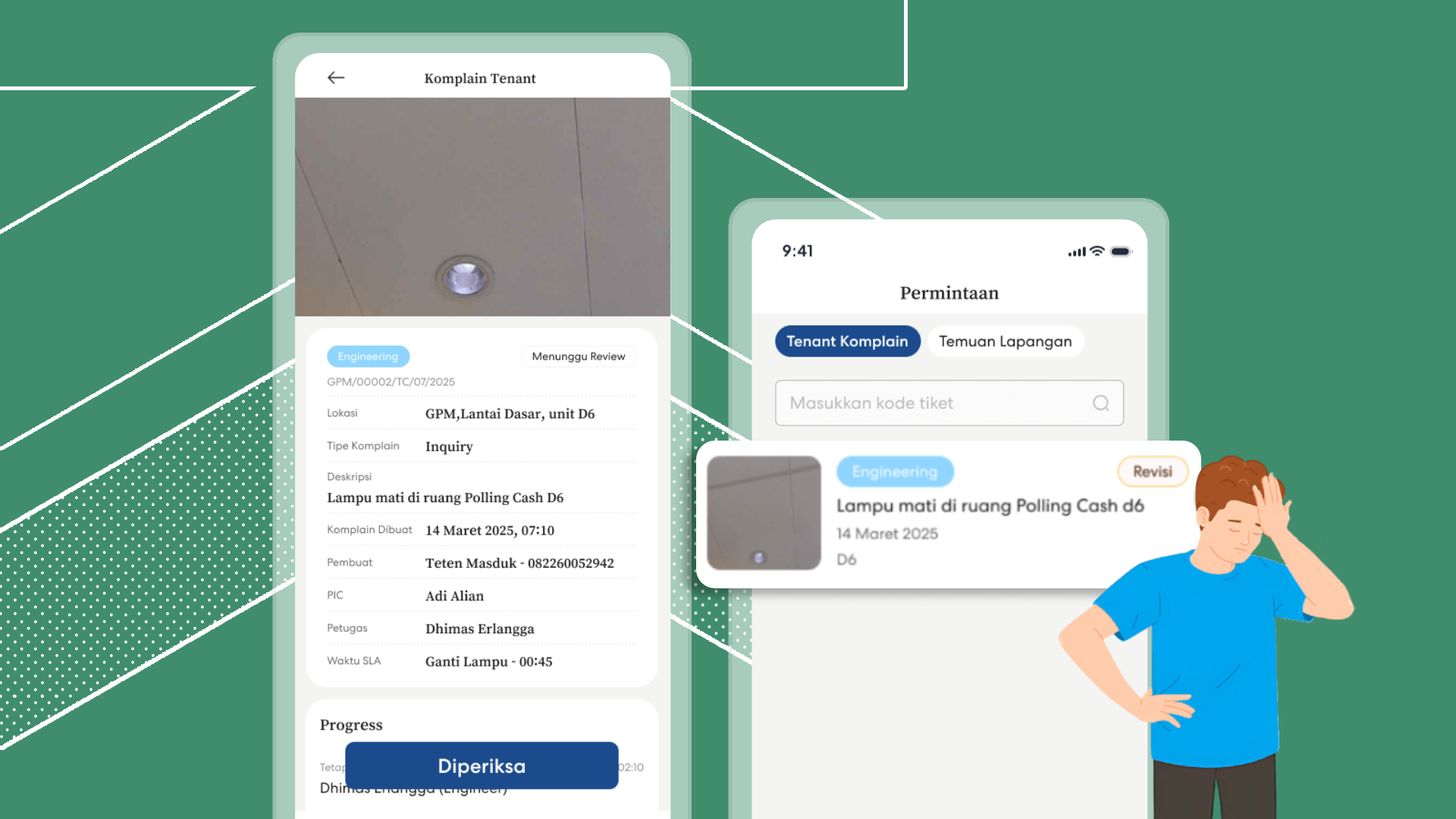 Tenant/penghuni bisa melaporkan keluhan dan memantau status penyelesaian.