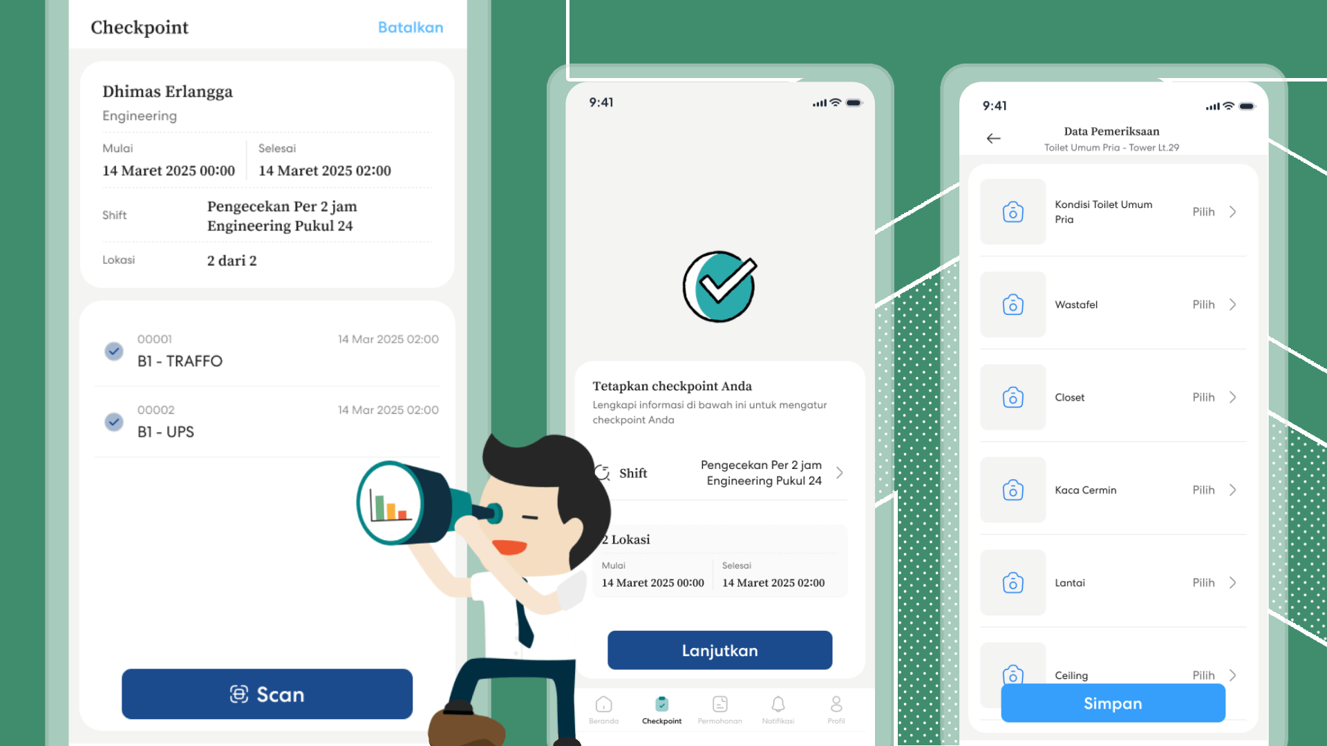Semua aktivitas gedung seperti absensi, shift, patroli, hingga housekeeping dikelola dalam satu aplikasi terintegrasi.
